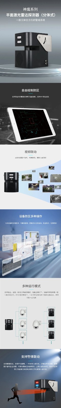 看完此视频,相信大家对分体式平面激光雷达已经有所了解。而完整的预警系统由平面激光雷达、控制器、摄像头及管理软件构成,可以实现在激光雷达扫描范围内的有效报警,当发现入侵人员时,雷达会进行声光报警,球机跟踪拍摄等功能。另外,系统可连接客户球机,在不改变摄像头位置的情况下,灵活选择设备安装位置,同样可实现球机跟踪拍摄功能。