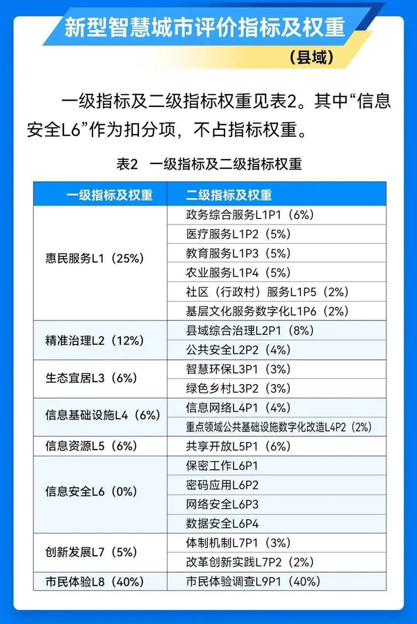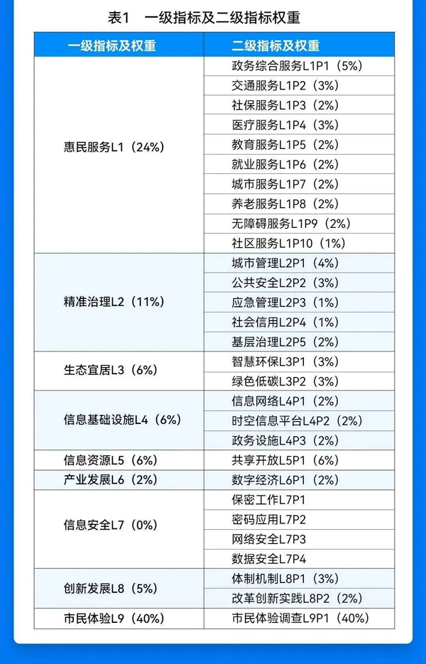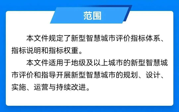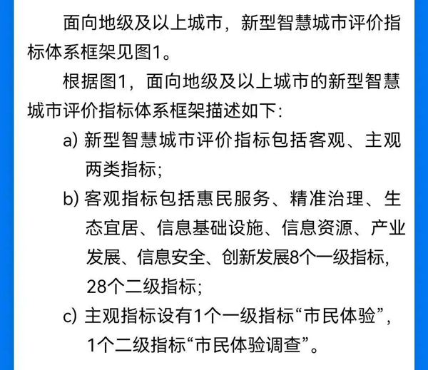 据了解,《评价指标》规定了面向地级及以上城市的新型智慧城市评价指标体系、指标说明和指标权重,共包含9项一级指标,29项二级指标,62项二级指标分项。同时,该标准在附录A中针对县及县级市的新型智慧城市建设给出了可参考使用的评价指标。该标准适用于新型智慧城市评价工作,并可用于指导新型智慧城市的规划、设计、实施、运营与持续改进等活动。
