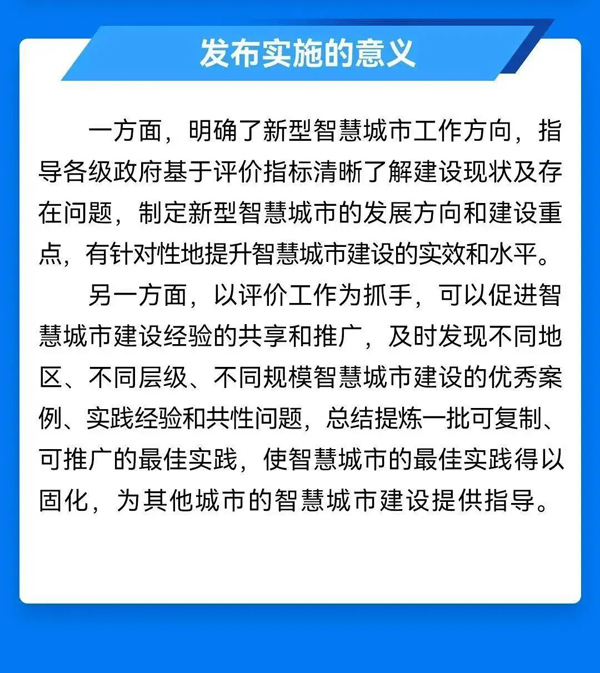 《评价指标》的发布与实施,可以更好地支撑开展新型智慧城市评价工作。开展新型智慧城市评价可以科学衡量各地新型智慧城市建设成效,总结典型实践经验,实现“以评促建,以评促改,以评促管”,助力新型智慧城市健康可持续发展。