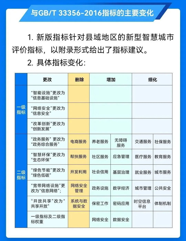《新型智慧城市评价指标》(GB/T33356-2022)(以下简称《评价指标》)近日经市场监管总局(标准委)批准发布,将于2023年5月1日起正式实施。这是2016年《新型智慧城市评价指标》(GB/T33356-2016)发布后首次修订。